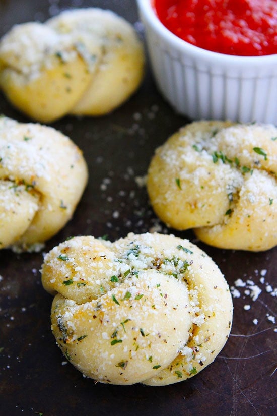These soft and buttery garlic knots taste just like your favorite pizzeria’s garlic knots, but are fun and easy to make at home. They are so good fresh out of the oven!
