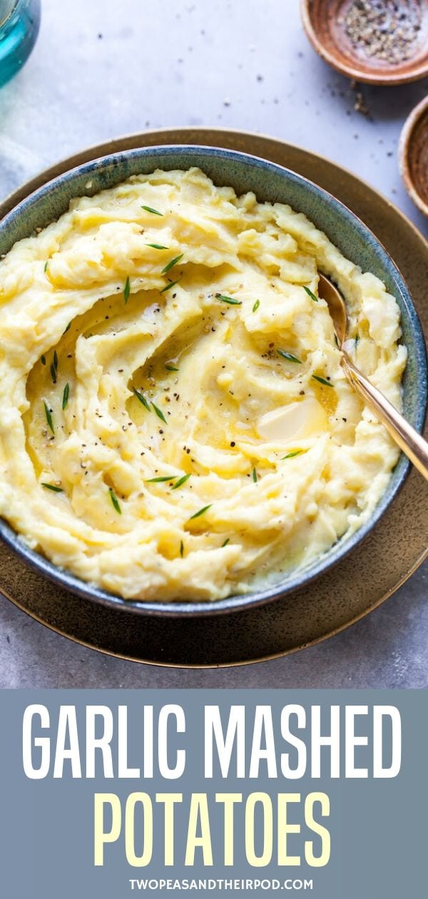 My version of the perfect mashed potatoes recipe: roasted garlic, half and half, plenty of butter, and a sprinkling of chives. YUM! These mashed potatoes are rich, fluffy, and a family favorite side dish.