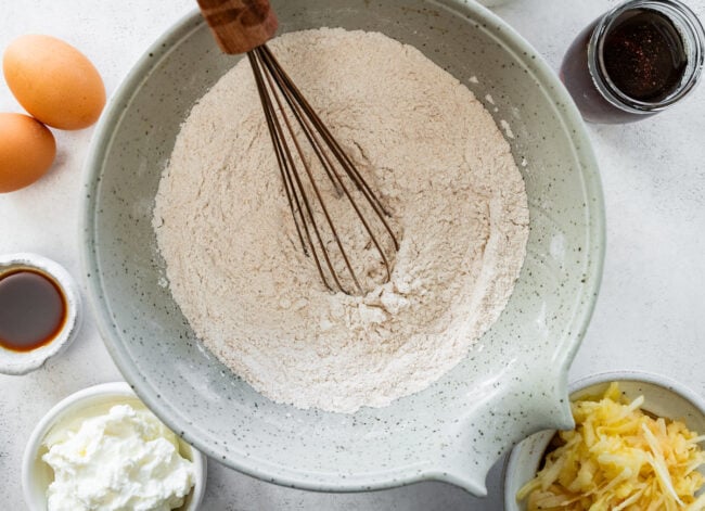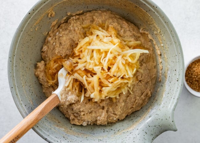 - Add the wet ingredients to the dry ingredients and stir until just combined. Don’t over mix. Gently fold in the grated apple.