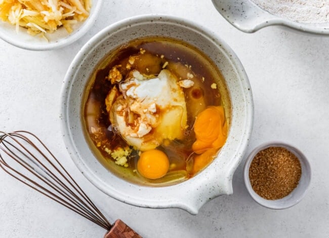- In a medium bowl, whisk together the applesauce, Greek yogurt, maple syrup, oil, eggs, and vanilla extract.
