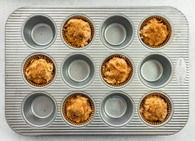 - Divide the batter equally amongst the muffin cups, filling them to the top. Sprinkle the tops generously with turbinado sugar.
