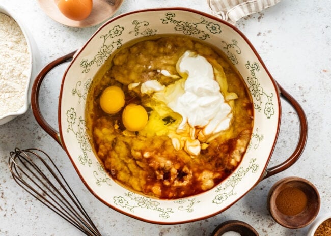 - In a large bowl, mash the bananas with a fork until smooth. Whisk in the Greek yogurt, maple syrup, eggs, oil, and vanilla until well combined.