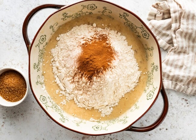 - Add the flour, baking soda, cinnamon, and salt. Gently stir just until combined, being careful not to overmix.