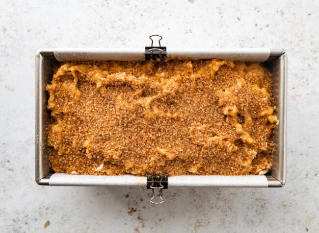 - Pour the batter into the prepared loaf pan and smooth the top. Sprinkle evenly with turbinado sugar.