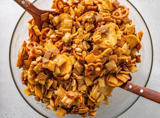 Once completely cooled, store the Chex Mix in an airtight container at room temperature. It will stay crunchy for up to 2 weeks (if it lasts that long!). For longer storage, you can freeze it in a sealed bag for up to a month.