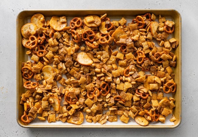 - Cool. Remove from the oven and let cool completely on the baking sheet. The Chex mix will crisp up as it cools.