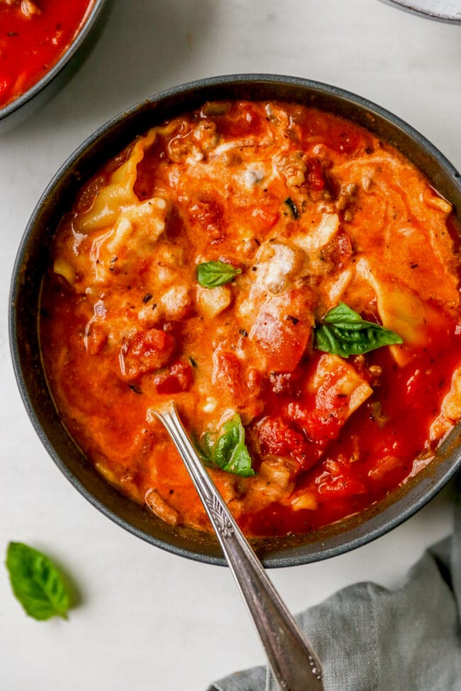 This is lasagna made on the stove in one pot, soup style! Lasagna Soup is filled with Italian sausage, tons of veggies, robust flavor, and topped with the dreamiest cheese dollop for a bowl of filling, delicious goodness.