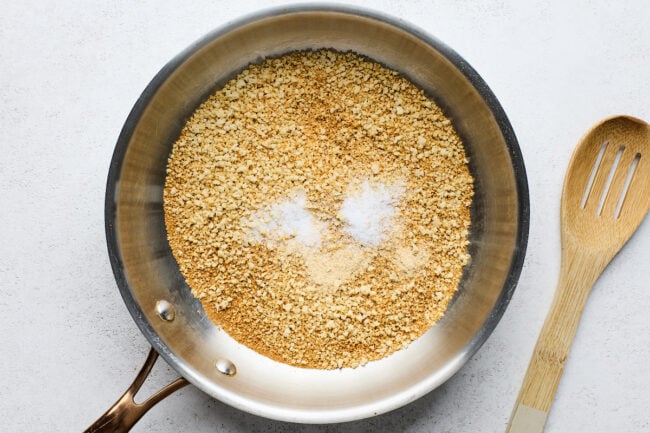 - Make the breadcrumbs. In a small skillet over medium heat, add the panko. Toast, stirring frequently, until golden brown and crisp, about 3 to 4 minutes. Remove from the heat and stir in the salt and garlic powder. Transfer to a bowl or plate and set aside to cool.