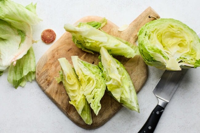 - Prepare the lettuce. Remove any wilted outer leaves. Cut the head of iceberg lettuce in half through the core, then cut each half into 3 even wedges. You’ll have 4 to 6 wedges total.