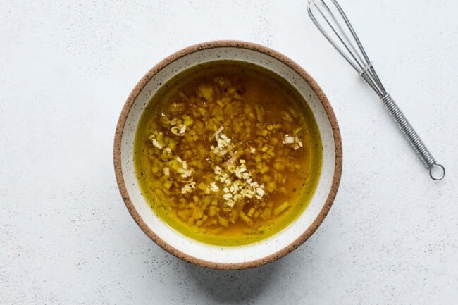 - Make the dressing. In a small bowl or jar, whisk together the olive oil, lemon juice, red wine vinegar, Dijon mustard, honey, shallot, and garlic until well combined. Season with kosher salt and black pepper to taste. Set aside.