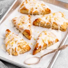 - While the scones are cooling, make the lemon glaze. In a small bowl, whisk the confectioners’ sugar, lemon juice, and heavy cream together until smooth. Drizzle glaze generously over the cooled scones. Enjoy!