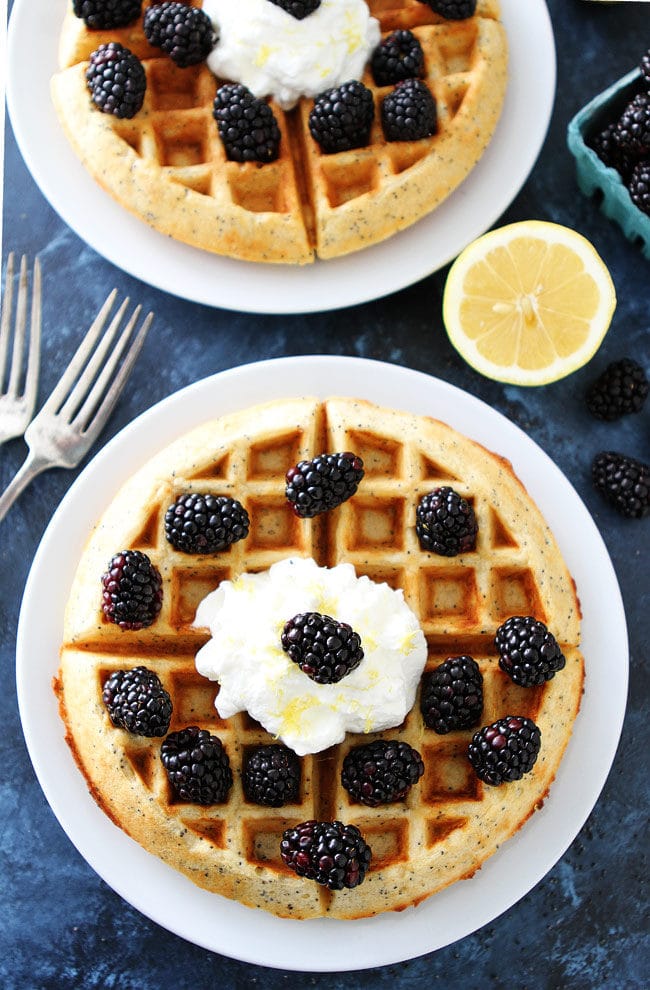 Lemon Poppy Seed Waffles with lemon whipped cream and fresh blackberries make a wonderful breakfast or brunch.