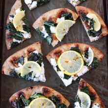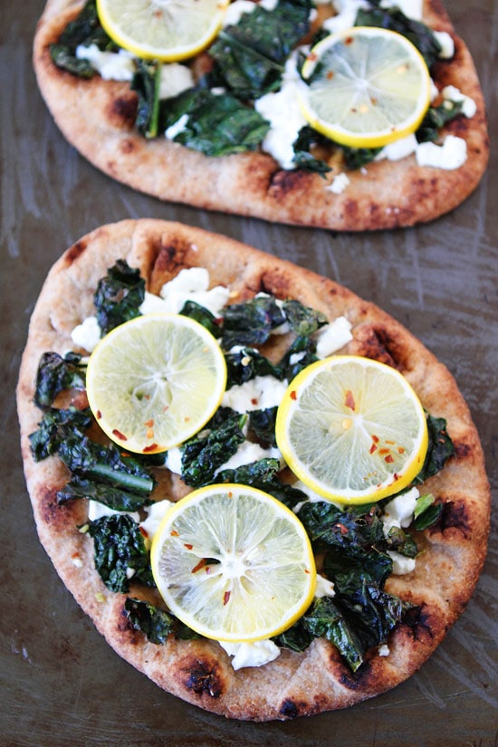 - Place the Naan flatbreads on a large baking sheet. Brush each flatbread with a little bit of olive oil. Sprinkle chunks of goat cheese evenly over the breads. Top with cooked kale and lemon slices. You will want 3-4 lemon slices for each flatbread. Sprinkle crushed red pepper over the flatbreads, if using.
