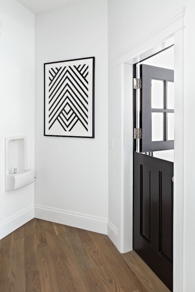 By our back door, outside the laundry room, we have a drinking fountain for the boys and a Dutch door. I love Dutch doors and it was another MUST on my list:) The door color is Tricorn Black by Sherwin-Williams, my favorite black. All of our interior and exterior doors are this color. I am SO glad we went with black inside and out! All of the white paint is Extra White by Sherwin-Williams.