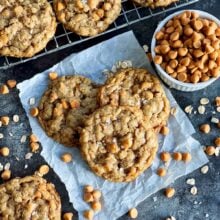 The cinnamon spiced oatmeal cookies are soft and chewy in the center, slightly crisp around the edges, and loaded with sweet butterscotch chips. I add a sprinkle of sea salt when they come out of the oven for the perfect finishing touch.