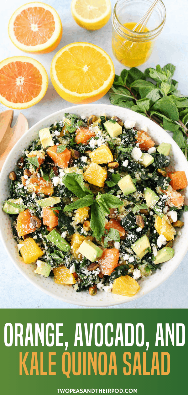 Orange, Avocado, and Kale Quinoa Salad-kale salad with quinoa, orange, avocado, pistachios, feta cheese, mint, and a simple citrus dressing. You will love this refreshing and healthy salad.