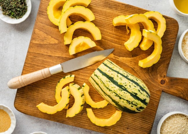 - Prepare the squash: Slice the squash in half lengthwise and scoop out the seeds with a spoon. Cut the halves into slices (about 1/2-inch thick) to form half-moons. Set aside.