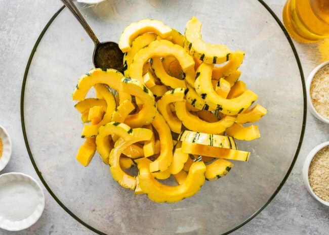 - Toss the squash in olive oil: Place the squash in a medium bowl and drizzle with olive oil. Toss until well coated.