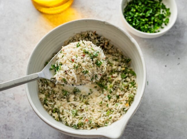 - Make the parmesan topping: In a medium bowl, combine the Parmesan, panko, parsley, thyme, garlic powder, salt, and crushed red pepper flakes. Set aside.