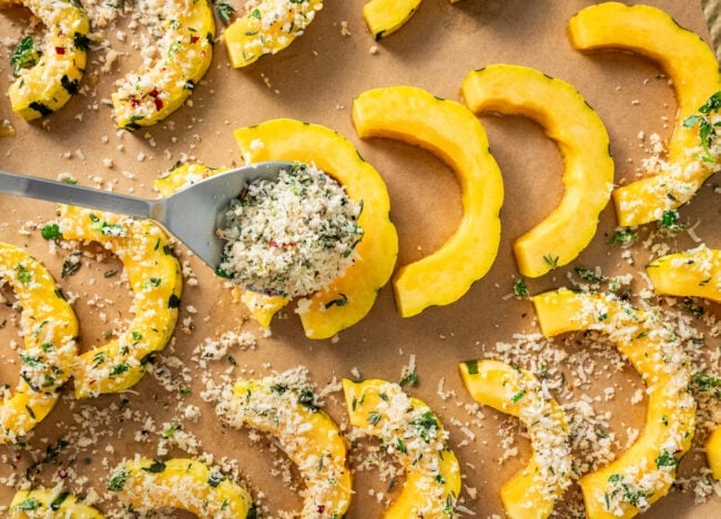 - Press the topping onto the squash to help it adhere and get extra crisp.