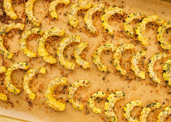 Delicata squash season is one of my favorite moments of fall. It’s the unsung hero of winter squash…sweet, easy to cut, quick to roast, and you don’t even have to peel it (a huge win!). When you pair it with nutty parmesan, crunchy panko, and fresh herbs, it becomes one of those deceptively simple dishes that tastes restaurant-worthy with minimal effort.