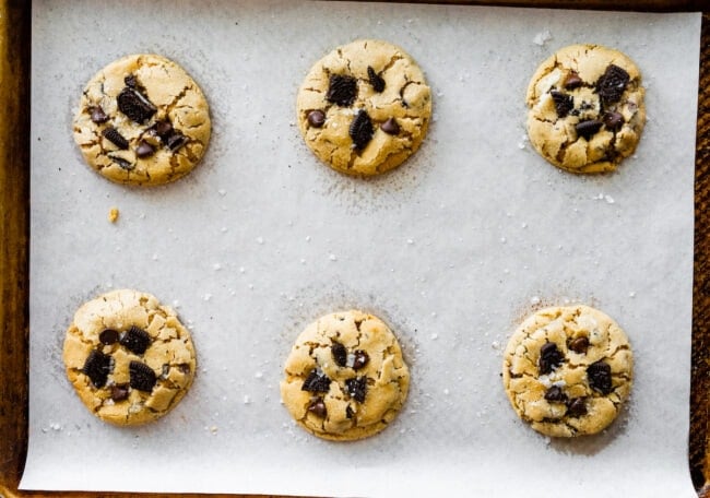 - Bake the cookies for 8 to 11 minutes or until they are golden at the edges and just set. Don't over bake, the cookies will set up as they cool. Remove pan from oven and sprinkle with flaky sea salt. While the cookies are still warm, you can gently press extra Oreo pieces on top of the cookies.