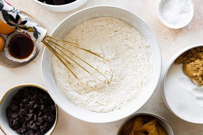 - In a medium bowl, whisk together flour, baking soda, baking powder, and salt. Set aside.