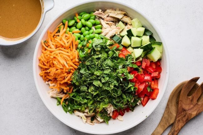 - In a large bowl, combine the chicken, edamame, cucumber, red pepper, carrots, green onion, cilantro, and mint.