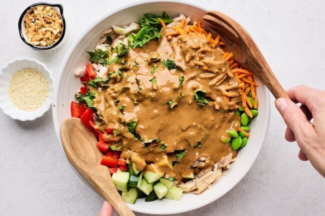 The creamy peanut dressing is what sets this salad apart. It’s rich and nutty from peanut butter, brightened with fresh lime juice, and balanced with ginger, garlic, and a touch of sweetness. When tossed with shredded chicken, crisp vegetables, and plenty of fresh herbs, the result is a salad that’s satisfying without feeling heavy.