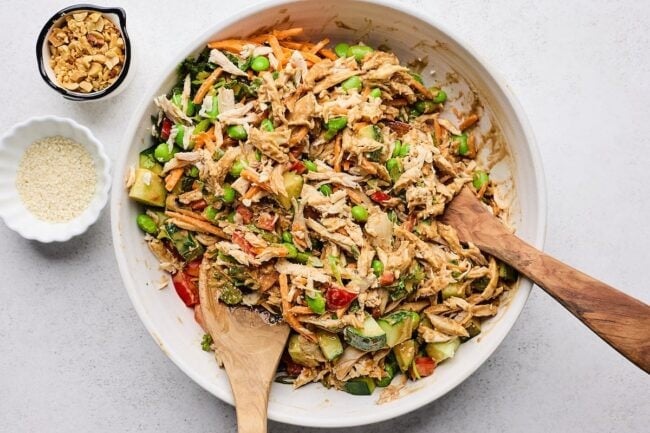 This is one of those recipes that feels effortless but delivers big flavor. I use rotisserie chicken to keep things easy, then add edamame, cucumber, bell pepper, carrots, cilantro, and mint for crunch and freshness. A generous sprinkle of chopped peanuts and sesame seeds on top finishes it off perfectly.
