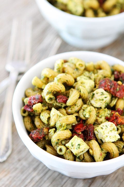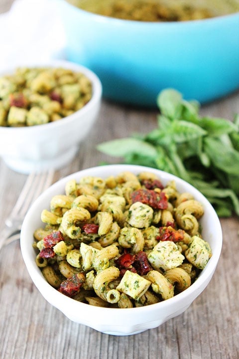We love serving this pasta dish to family and friends when they visit for the holidays because it’s festive and easy to make! When your house is full of company, it’s important to have an easy recipe on hand that will still WOW a crowd. Pesto Chicken Pasta with Sun-Dried Tomatoes is that recipe. It’s always a hit!