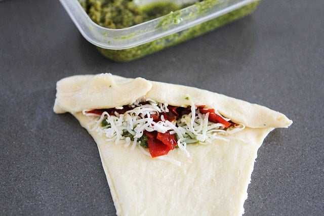 - Unroll crescent rolls. Place about a ½ tablespoon basil pesto, 2 teaspoons chopped roasted red peppers, and 2 teaspoons grated mozzarella cheese in the center of each crescent roll.