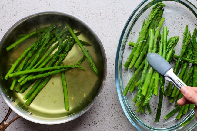 - Avoid overcooking the asparagus, just until bright green and crisp-tender. Transfer asparagus to an ice bath to stop the cooking and preserve color.