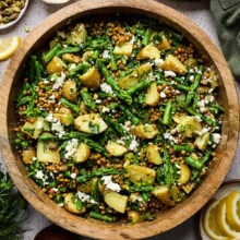 You get creamy, tender potatoes, crisp-tender asparagus, and hearty lentils (hello, plant-based protein!) all tossed together with salty feta, fresh herbs, and crunchy pistachios. And then there’s the dressing…a bright lemon Dijon vinaigrette that ties everything together in the best way. It’s tangy, slightly sweet, and full of flavor—basically the kind of dressing you’ll want to put on everything.