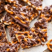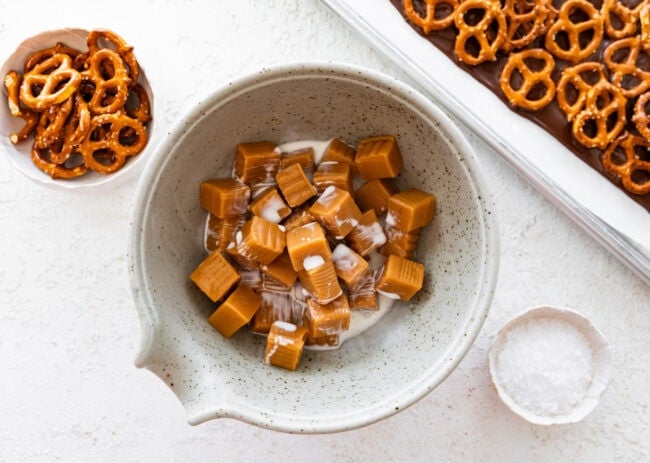 - Pretzels: Use mini twist pretzels rather than sticks or other shapes. They’re sturdy, hold up well under the chocolate and caramel, and give the perfect crunch. If you need the bark to be gluten-free, use gluten-free pretzels.