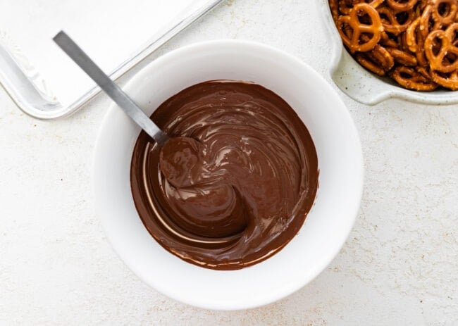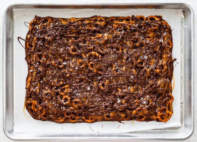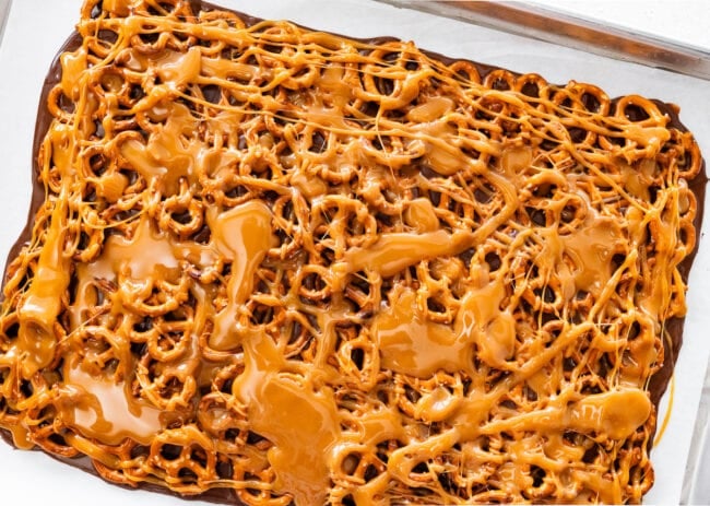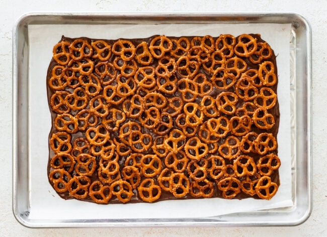 - Cover the chocolate completely with pretzels. A full layer ensures the perfect crunch in every bite. Overlapping is great!