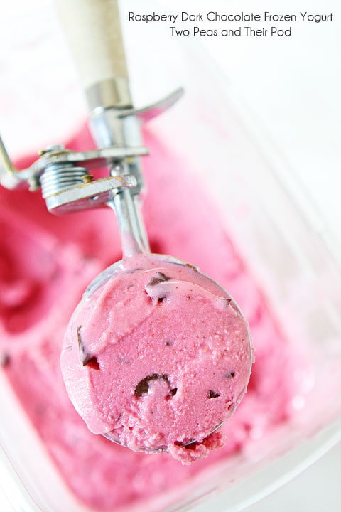Want a scoop? I know I do! I am going to keep a container of this Raspberry Dark Chocolate Frozen Yogurt in our freezer at all times. It is the perfect cool down treat for summer! And I love that I don’t have to leave my house to enjoy frozen yogurt. Don’t tell the yogurt shops, but I think my Raspberry Dark Chocolate Frozen Yogurt is way better! 🙂