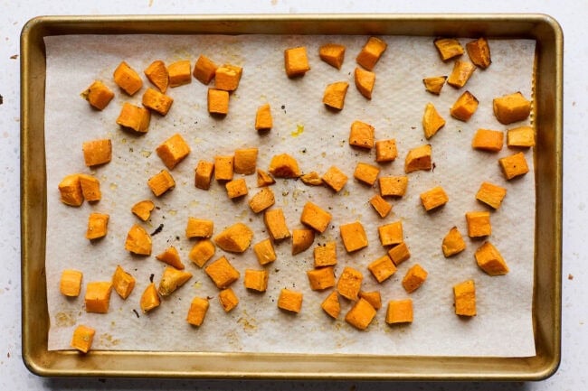 - Sweet Potato: Cut into even cubes so they roast evenly and caramelize nicely.