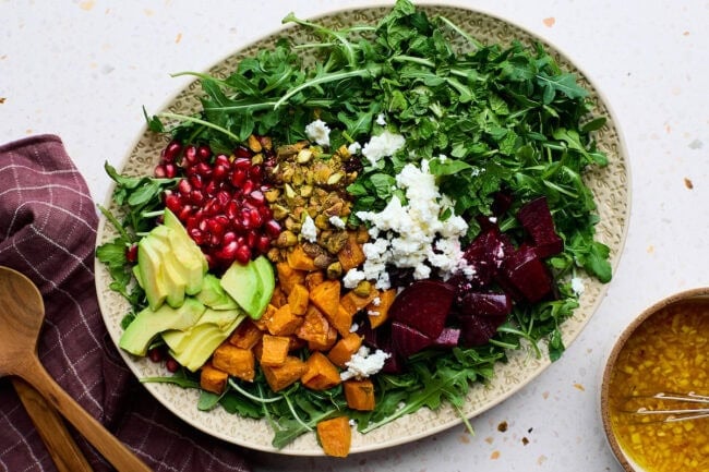 - In a large bowl or on a platter, add the arugula, roasted beets, sweet potatoes, pomegranate, pistachios, avocado, goat cheese, and mint.