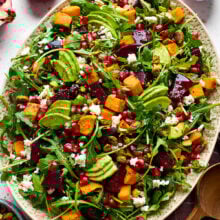 Roasting the sweet potatoes and beets brings out their natural sweetness and gives them incredible depth, which is exactly what a good winter salad needs. I pair them with peppery arugula, creamy avocado, crunchy pistachios, juicy pomegranate arils, and tangy goat cheese, then finish everything with a bright citrus dressing that ties it all together. Every bite has something going on; sweet, savory, fresh, and a little tangy.