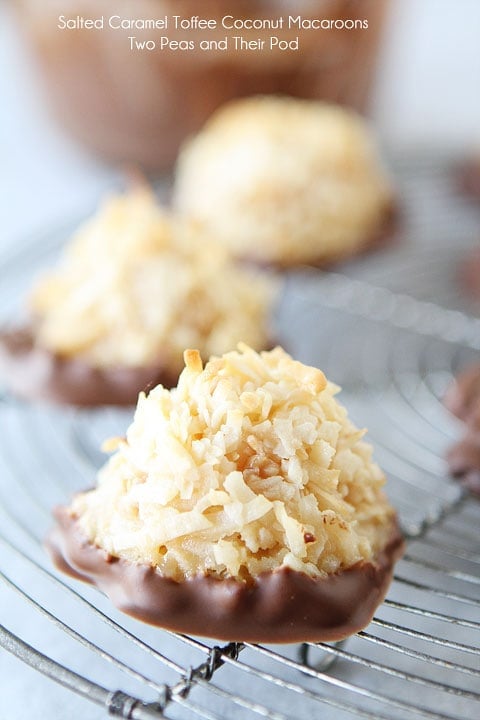 Salted Caramel Toffee Coconut Macaroons on twopeasandtheirpod.com They are dipped in chocolate too! The best coconut macaroons you will ever eat!