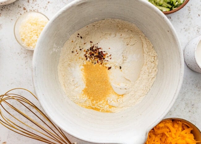 - Mix the dry ingredients. In a medium bowl, whisk together the flour, baking powder, salt, garlic powder, and crushed red pepper flakes. Set aside.