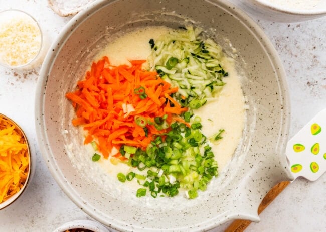 - Mix the wet ingredients. In a large bowl, whisk together the cooled melted butter, cottage cheese, milk, and eggs until smooth. Stir in the shredded zucchini, shredded carrots, and green onions.