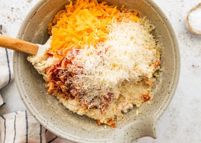 - Combine. Add the dry ingredients to the wet ingredients and stir gently until just combined. Do not overmix. The batter will be thick. Gently fold in the cheddar cheese, bacon (if using), and Parmesan cheese.