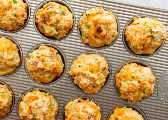 These muffins are loaded with goodness…sharp cheddar, crispy bacon, green onions, a sprinkle of Parmesan, and even veggies (zucchini and carrots). Every bite is savory, cheesy, and super satisfying. They kind of remind me of a savory biscuit, but in muffin form…which honestly makes them even easier and more fun to eat.