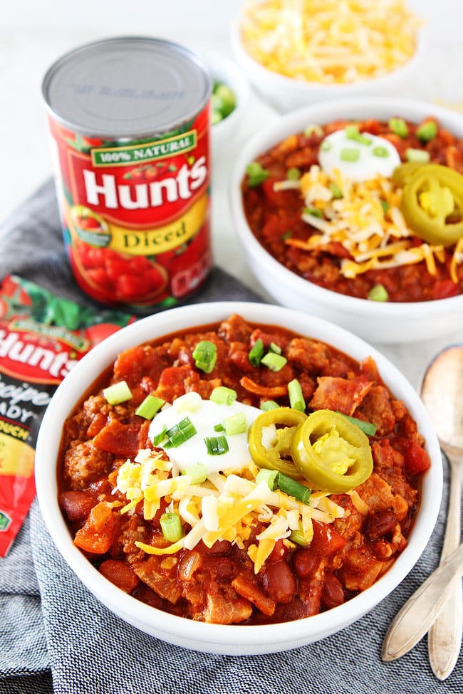 The chili is also made with onion, red bell pepper, garlic, Hunt’s Recipe Ready Tomato Paste, Hunt’s Tomato Sauce, Hunt’s Diced Tomatoes, beans, jalapeno, chili powder, cumin, and pure maple syrup. The maple syrup compliments the bacon and adds the perfect amount of sweetness to the chili.