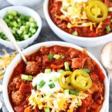When the chili is done simmering, it is time to load on the toppings! Top with shredded cheese, green onion, jalapeno slices, and sour cream. A loaded bowl of Smoky Bacon Chili is the perfect way to watch the game. And if you can’t wait until game day, this chili makes a great meal any day. Enjoy!