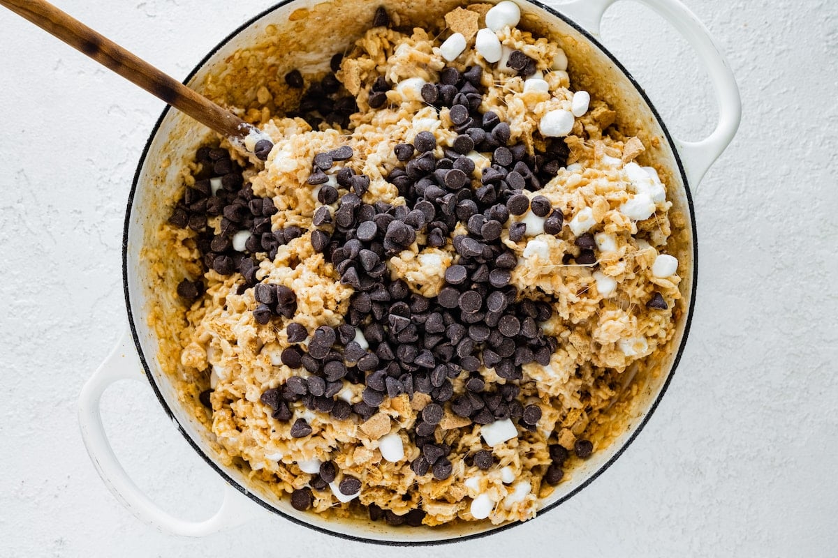 - Stir in the remaining 2 cups of mini marshmallows and graham cracker pieces. Fold in the chocolate chips.
