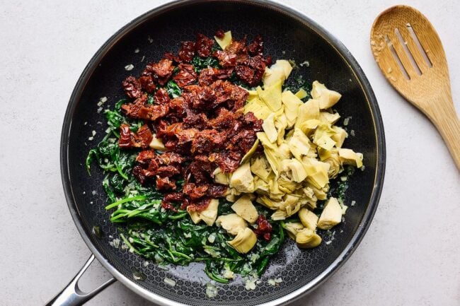 - Don’t skip draining the artichokes and sun-dried tomatoes really well—this is the biggest key to avoiding excess moisture.
