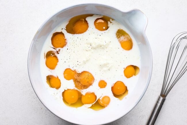 - In a large bowl, whisk together eggs, cottage cheese, and milk. Season with salt and black pepper, to taste.